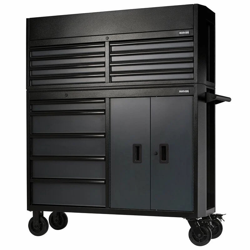 Der BUNKER Werkzeugwagen mit Topcase kombiniert höchste Funktionalität mit langlebiger Qualität und ist ideal für professionelle Werkstätten und anspruchsvolle Heimwerker. Mit 25 Soft-Close-Schubladen, einem stabilen Rollschrank und einer großzügigen Werkzeugtruhe bietet dieses Modell maximale Aufbewahrungskapazität und Organisation für alle Werkzeuge und Zubehörteile.